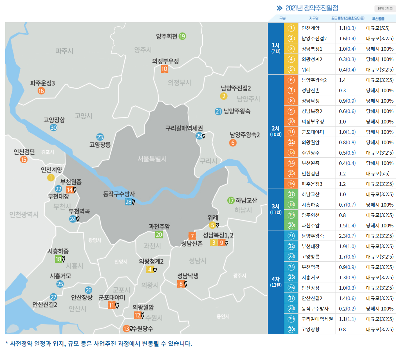 - ♡ 표시가 붙은 곳은 신혼희망타운 100%인 곳으로, 60㎡ 이하 유닛만 있을 곳